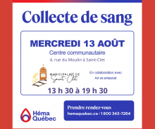 Une collecte de sang Hema-Québec aura lieu le mercredi 13 août 2025 de 13h30 à 19h30 à la salle communautaire de Saint-Clet située au 4, rue du Moulin à Saint-Clet.