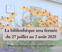 Prenez note que la bibliothèque sera fermée la semaine prochaine, soit du 27 juillet au 2 août 2025.